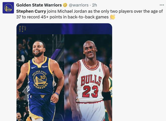 而在轰下49分之前,库里前一场比赛已经拿下46分,这让库里成为NBA历史上第二位在37岁后能够连续两场轰下45+得分的球员,另外一人是乔丹,也是NBA历史上连续两场砍下至少46分最老的球员。