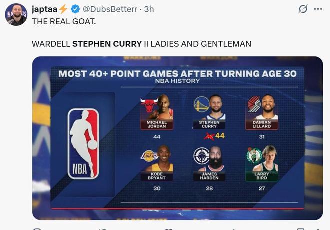 凭借这样的表现,37岁的库里一战刷爆历史纪录,首先是小球王者库里30岁后已经44次单场轰下40+得分,成功追平篮球之神乔丹并列历史第一。